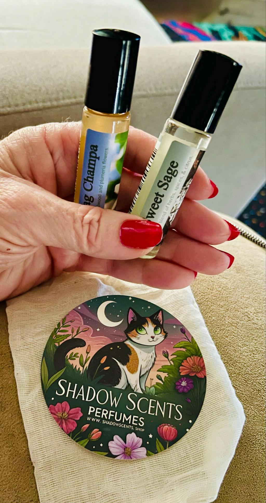 I originally discovered Shadow Scents at an amazing little metaphysical shop in Springfield, MO. I picked up Nag Champa for myself, Sandalwood for my husband, and Lavender for my sister— we were all IMMEDIATELY obsessed with how well the oils lasted throughout the day. I constantly receive compliments on these perfumes! I’m so grateful for this product and just loaded up on 4 more online (Egyptian Queen, Dragon’s Blood, Sweet Sage, & more Nag Champa)!!! I would recommend these to anyone and everyone who is also ready to steer clear of synthetic/toxic perfumes. Please consider offering Nag Champa in the larger roller— it’s now my signature scent :) Sending love to all!!!!